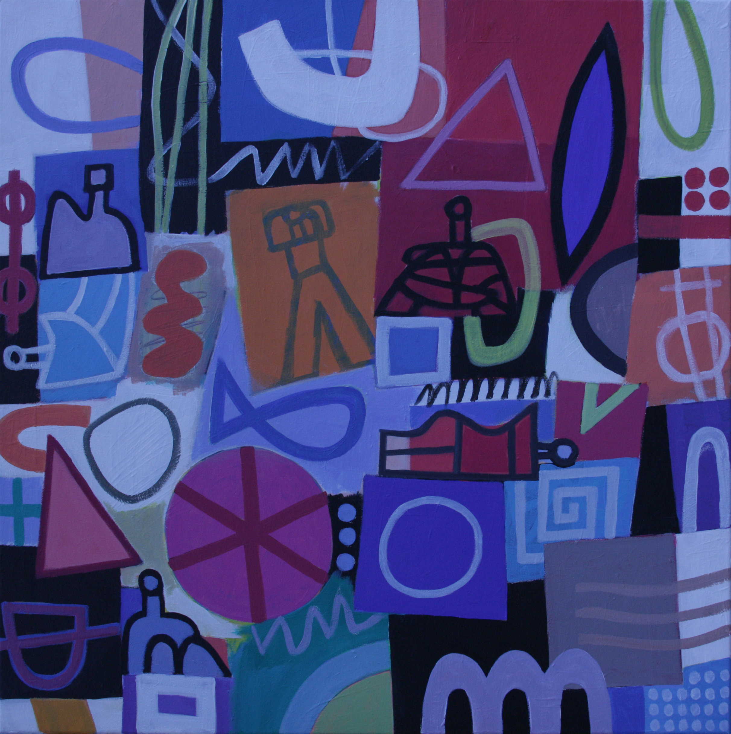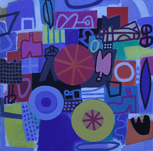 Vielfältige freie Formen schwirren um ein Zentrum, welches durch seine stabile quadratische Form das bunte und wirre Durcheinander zusammenhält. Gäbe es dieses Zentrum nicht – eine Art Zentral-(Regierungs-)Gebäude – würde die Bild-Welt wie unser ungesichertes Welt-Bild im Zeitalter der Globalisierung auseinander driften und sich als Chaos präsentieren.